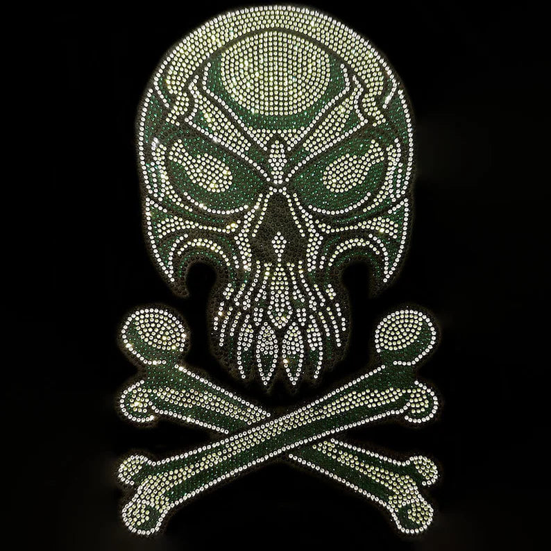 Skull design iron on patches , rhinestone skeleton applique , hot fix green skull with cross bones , heat transfer bedazzle skull design